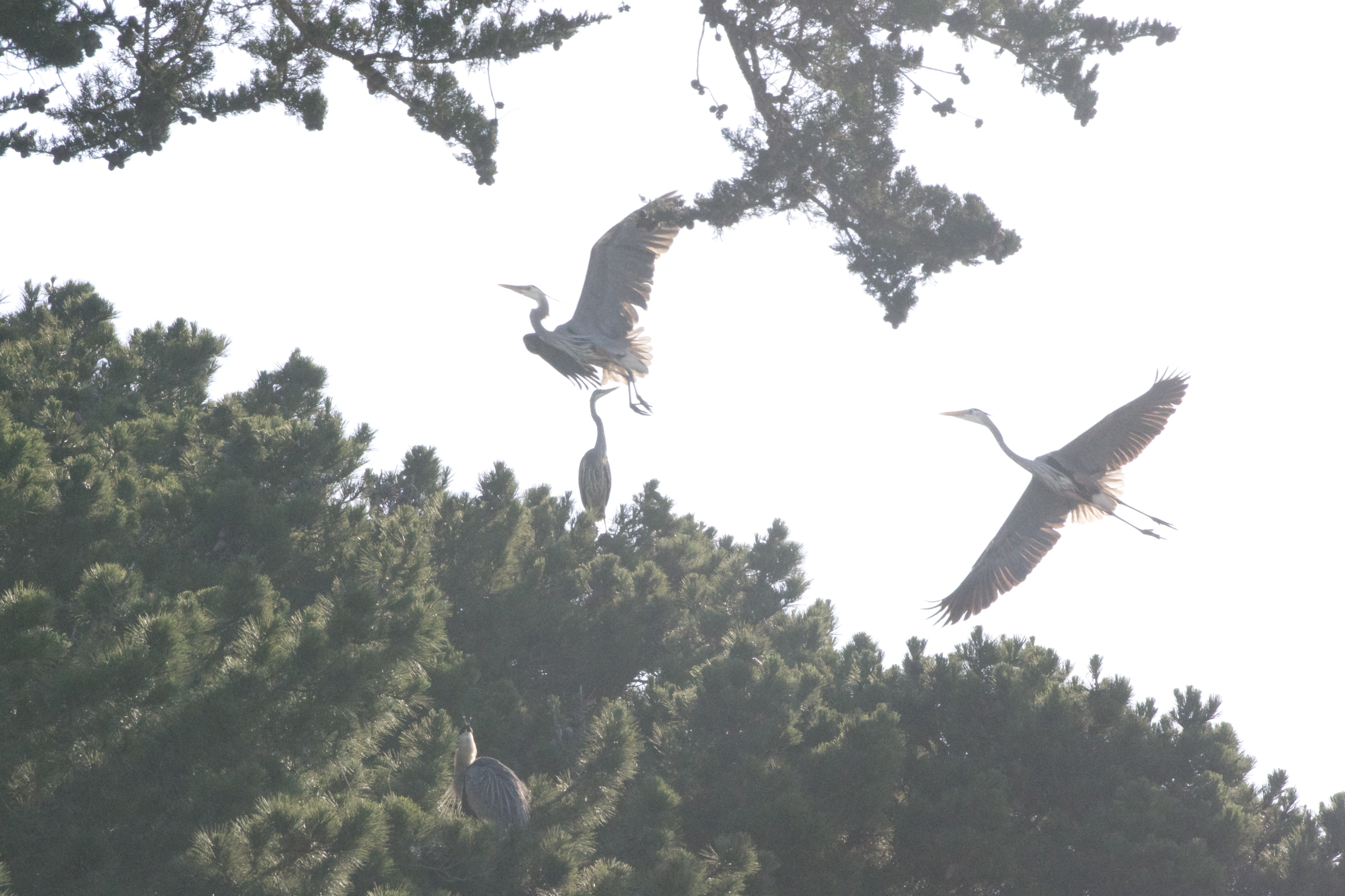 Great Blue Herons not only snack upon fish, they also hunt gophers and other rodents that populate our parks. Not much preys upon Great Blue Herons in turn although Great Horned Owls have been known to hunt them at times. There are 4 nests currently being used on the tree, but there is about 6 total. The most prized on is near the top of the tree, of enormous size as it has just been added to over the years. One nest fell off the tree at one point — which has since ended up at Audubon Canyon Ranch.